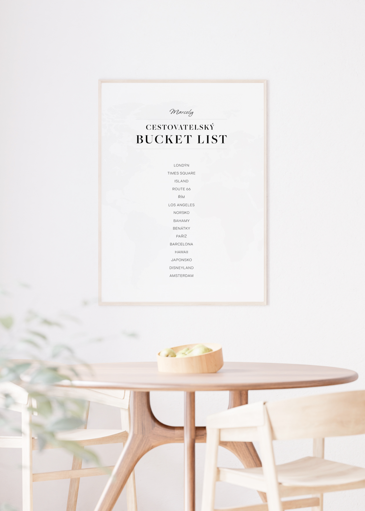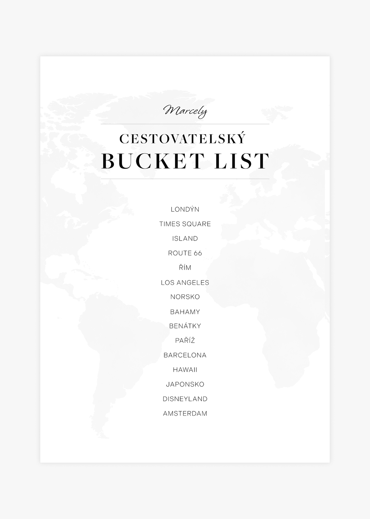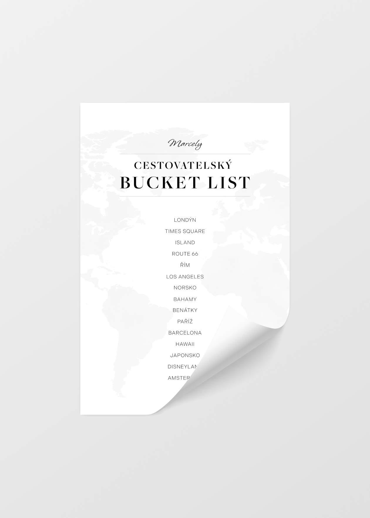 Personalizovatelný plakát se seznamem cestovatelských cílů a zážitků, které si můžete libovolně upravit. Stačí přidat své jméno a konkrétní místa, která chcete během svého života navštívit. Umístěte si plakát do svého oblíbeného prostoru a nechte se každý den motivovat k naplňování svých cestovatelských snů. Nabízíme také variantu se zaškrtávacím bucket listem, abyste mohli odškrtávat splněné cíle a sledovat svůj pokrok na cestě za nezapomenutelnými zážitky.
