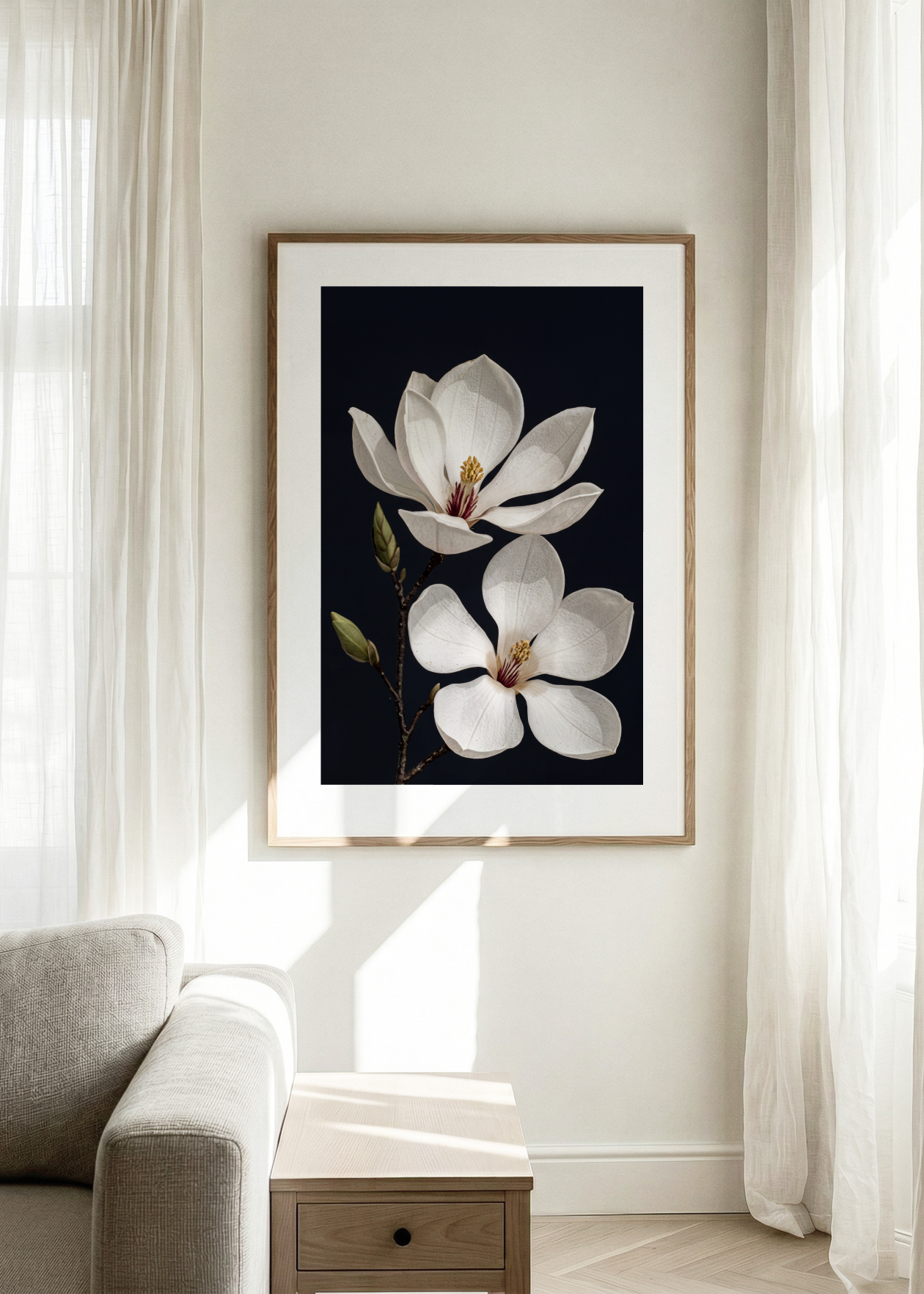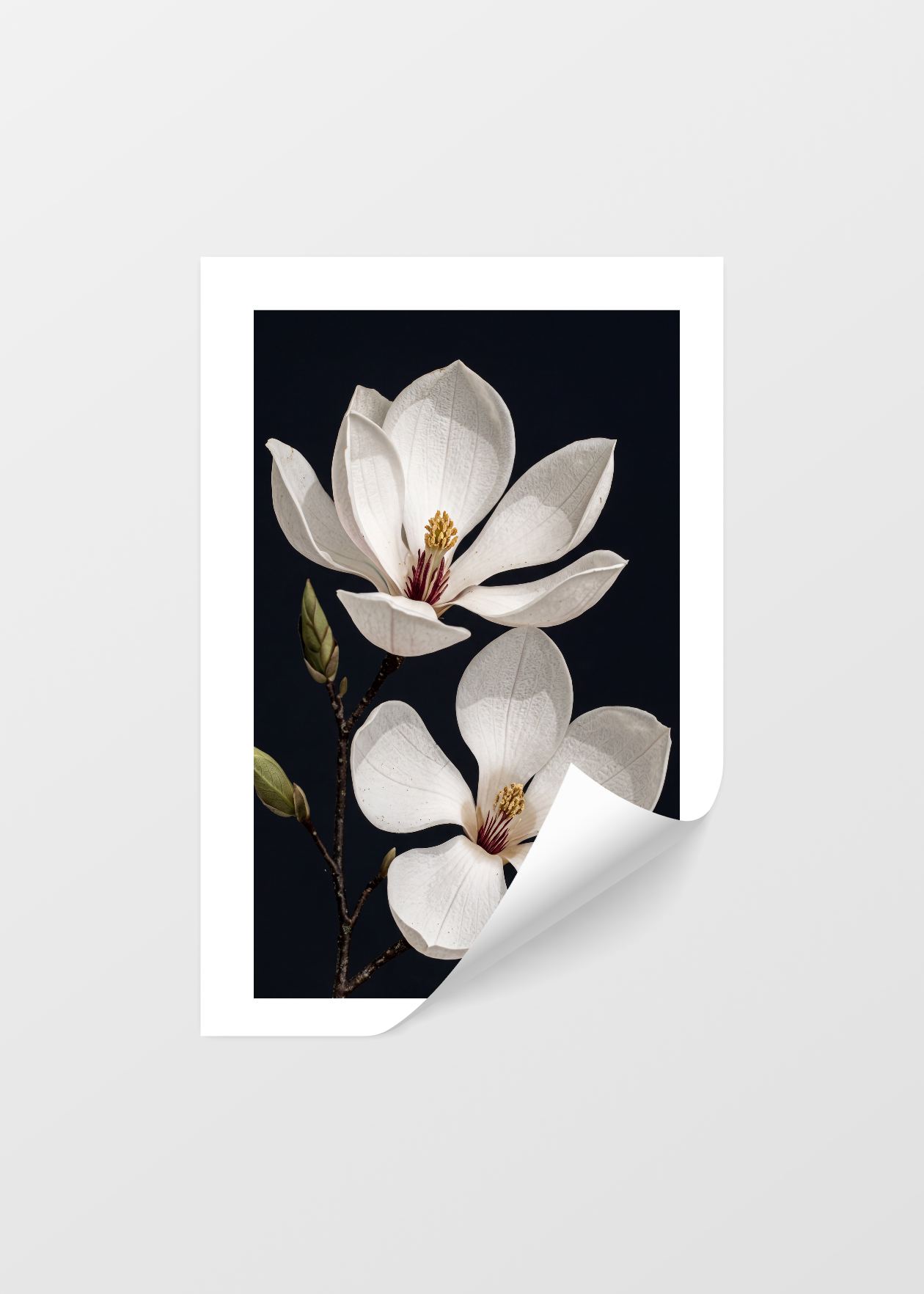 Dodejte svému domovu dotek dramatické krásy s luxusním plakátem umělecké fotografie bílé magnólie. Úchvatný detail dvou rozkvetlých květů na temném pozadí vytváří fascinující kontrast a dodává obrazu nečekanou hloubku. Tento sofistikovaný květinový motiv se stane nepřehlédnutelnou dominantou moderního obývacího pokoje, stylové ložnice či elegantní pracovny.