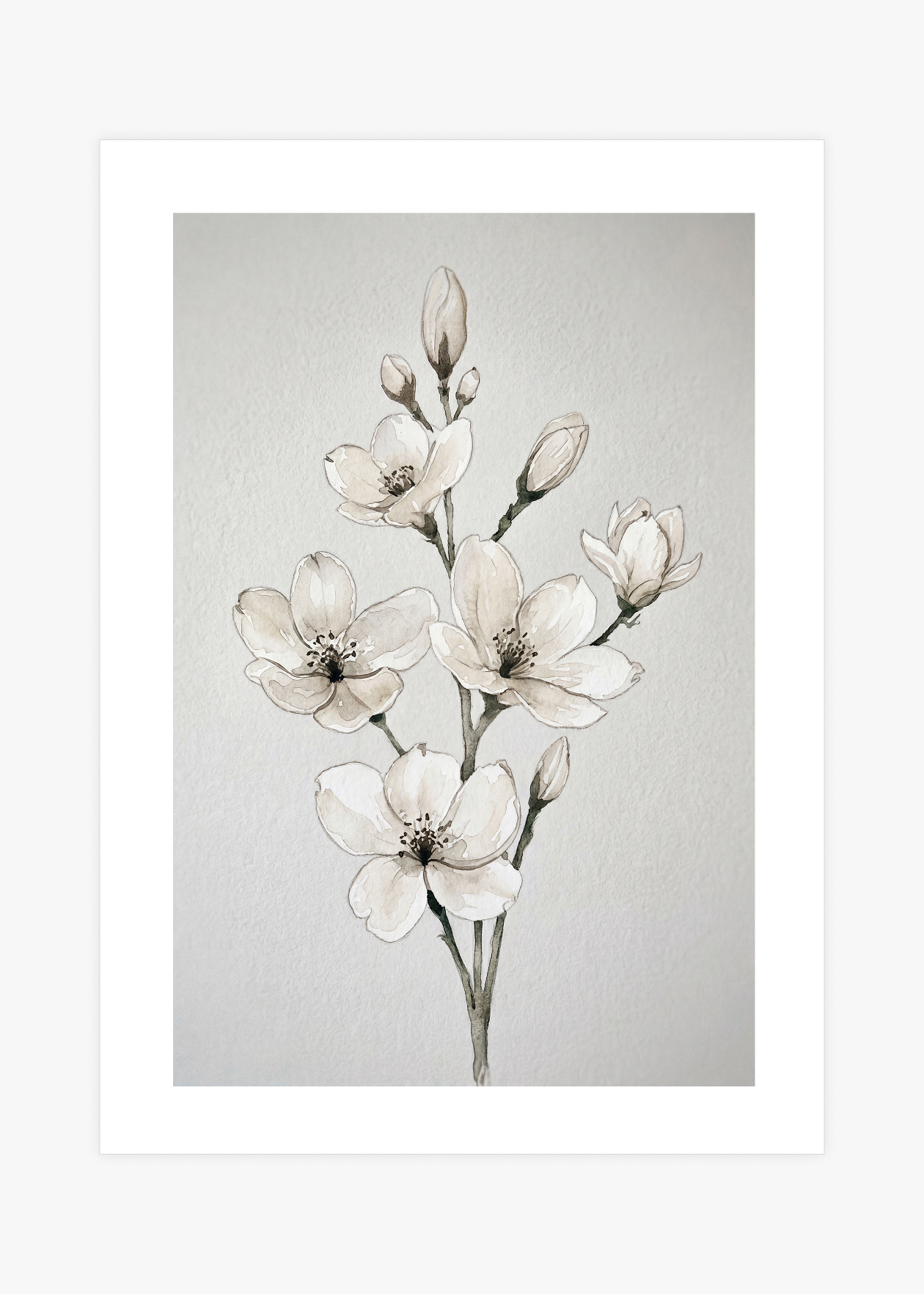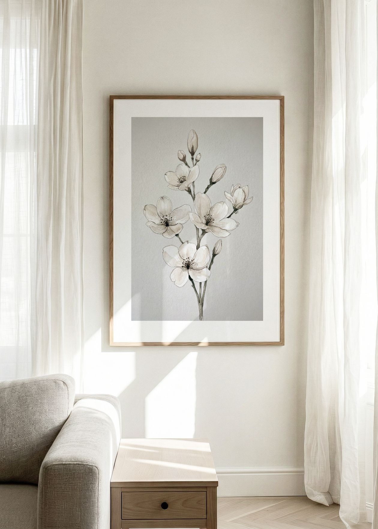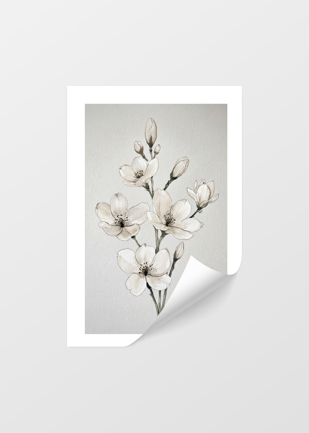 Podtrhněte útulnou atmosféru svého domova tímto elegantním plakátem z kolekce Esence květu. Nádherná akvarelová malba zachycuje křehké světlé květy, které do interiéru vnesou harmonii a nenápadnou krásu. Jemné neutrální tóny se snadno kombinují s jakýmkoliv stylem bydlení a úžasně vyniknou v ložnici, obývacím pokoji i na prázdné zdi v chodbě. Tento minimalistický květinový kousek působí dokonale jak samostatně, tak i v promyšlené kombinaci s dalšími plakáty z této vzdušné jarní série.