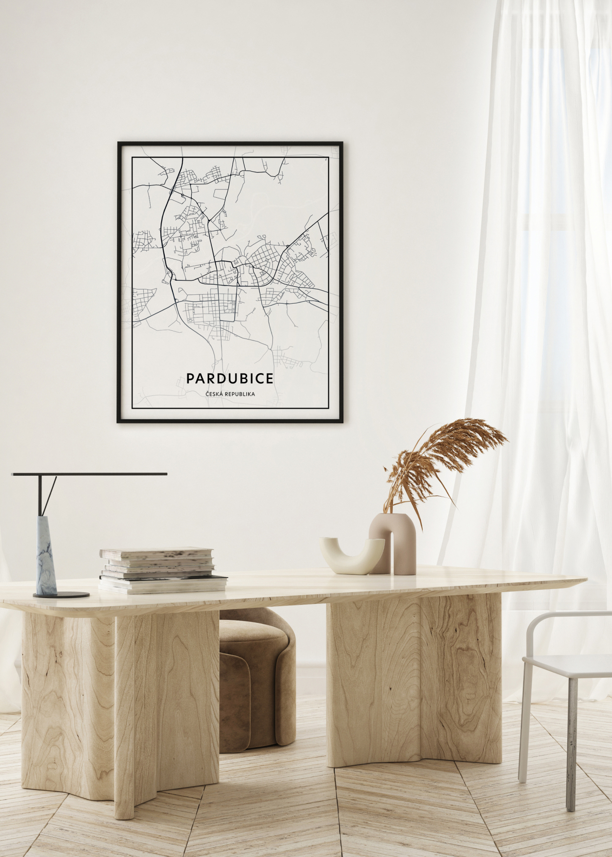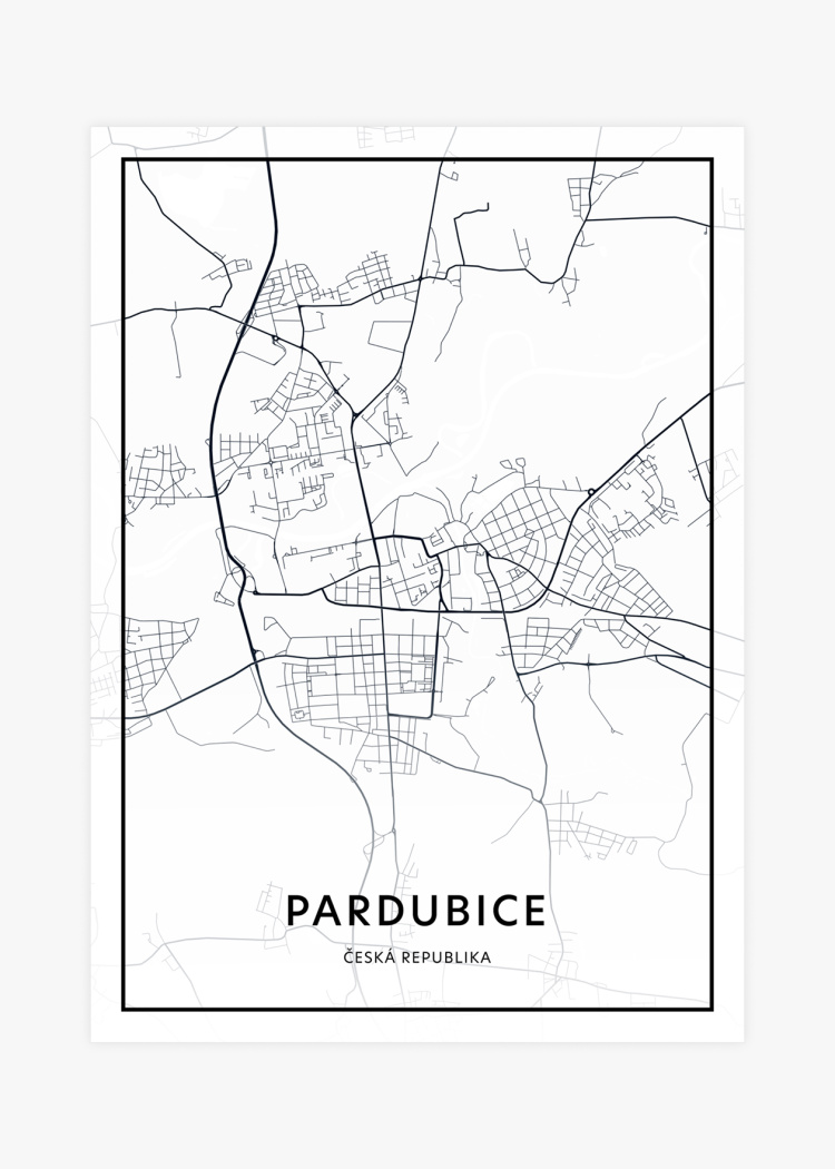 Plakát s mapou města Pardubice v černobílých odstínech. Tato minimalistická mapa je báječným doplňkem každého interiéru. Město Pardubice leží na východě Čech v Pardubickém kraji. Tento plakát je pro každého, komu město Pardubice přirostlo k srdci a má k němu osobní vztah.