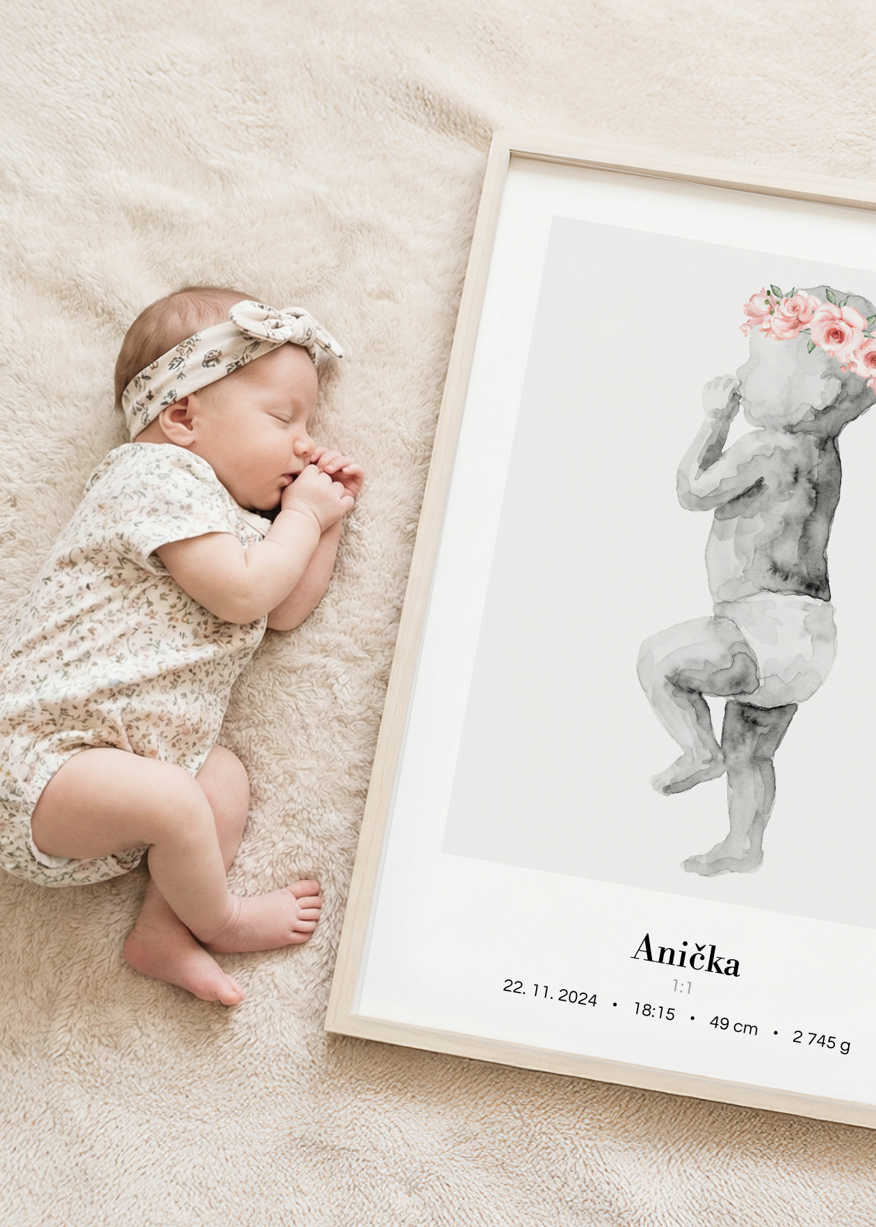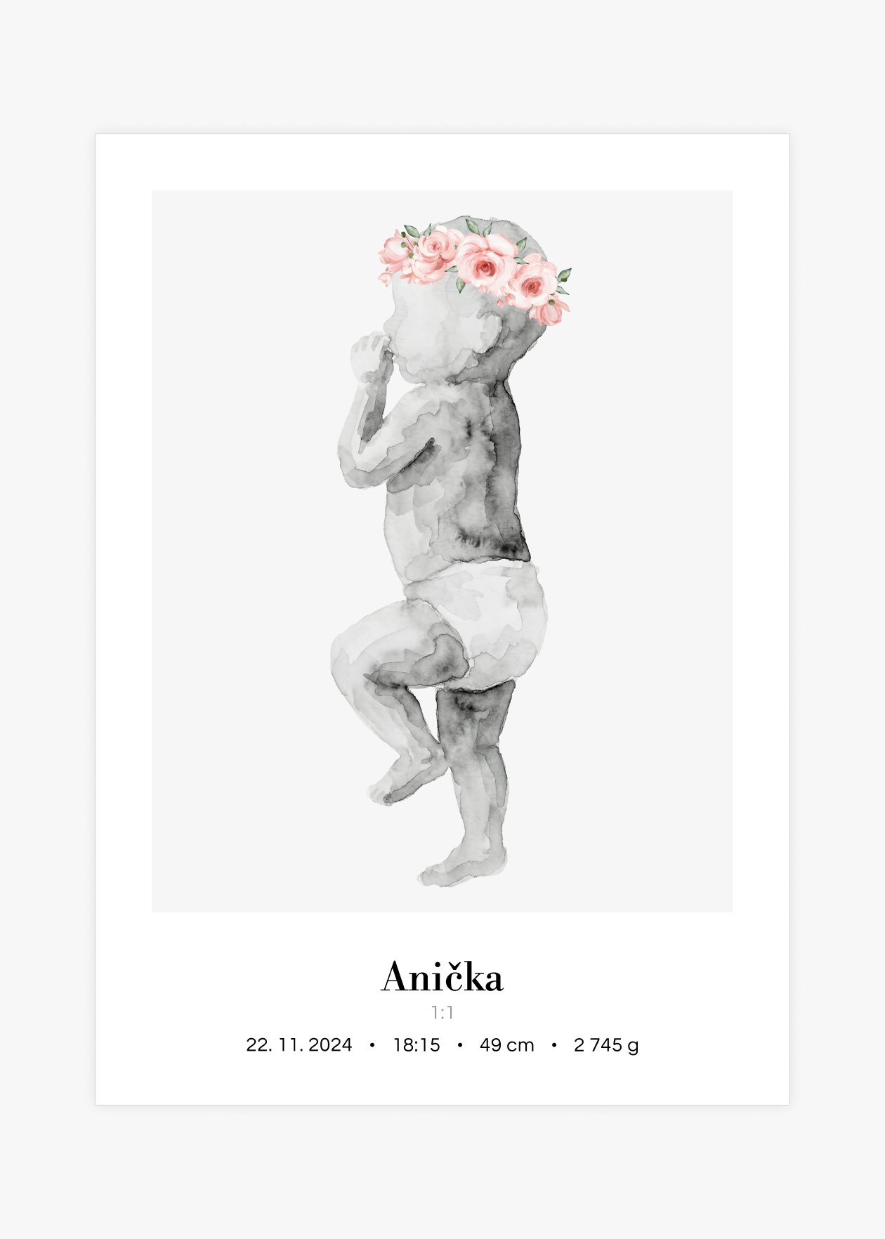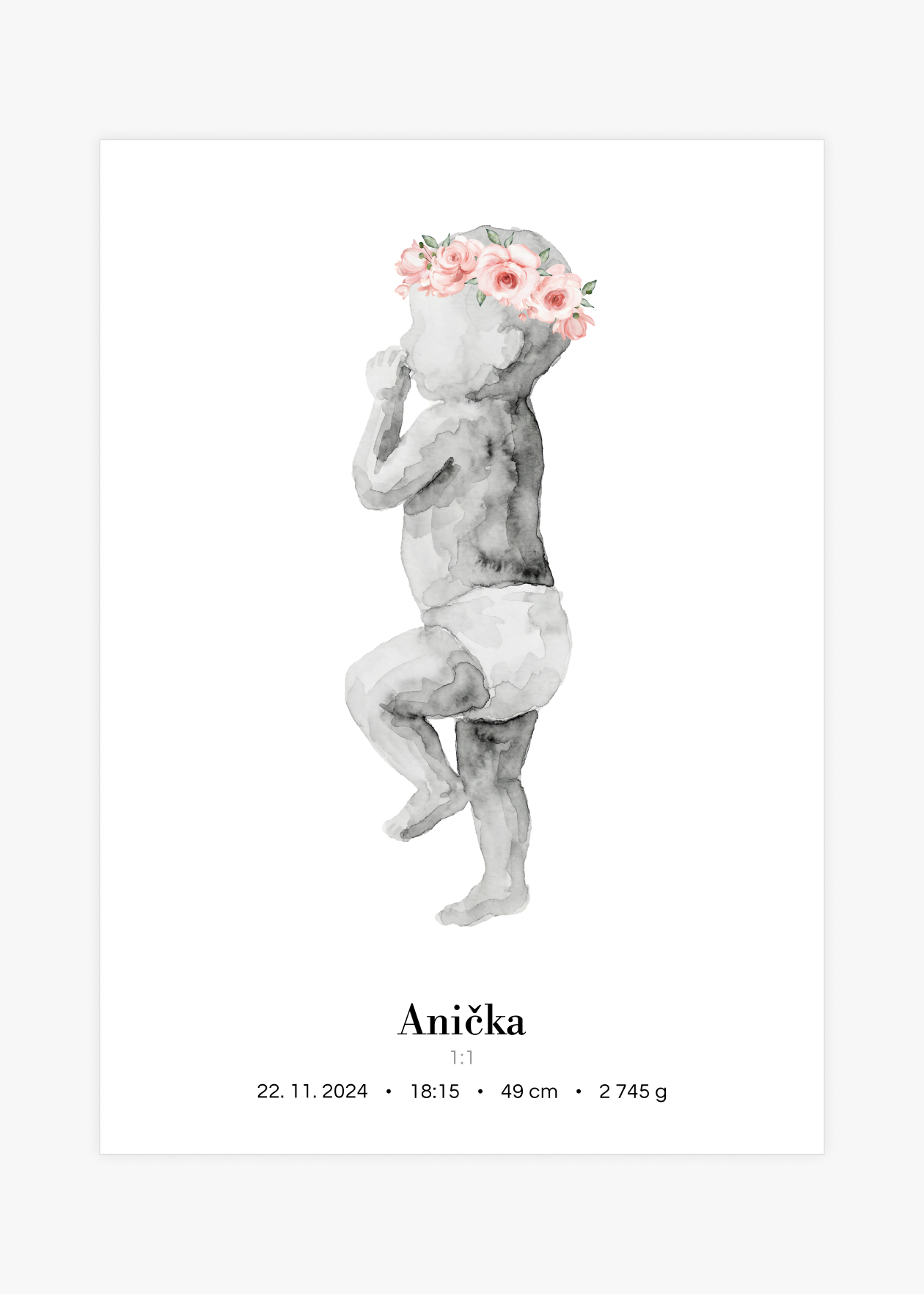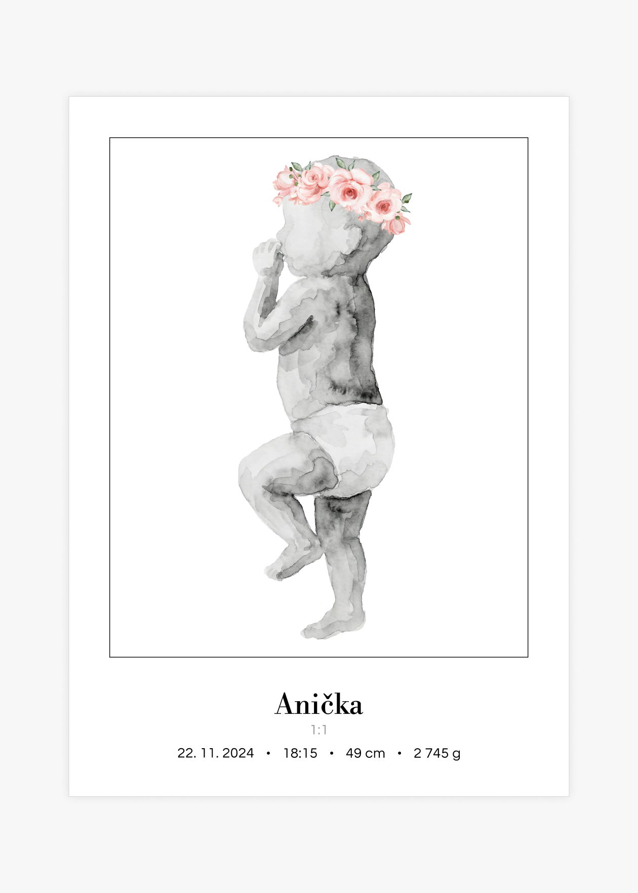 Plakát s ilustrací miminka v životní velikosti a personalizovaným textem ve spodní části. Originální způsob, jak si uchovat vzpomínku na jeden z nejdůležitějších okamžiků v životě – narození miminka. Tento plakát zachycuje vaše děťátko v přesné délce, jakou mělo při narození. Ilustrace je doplněna o personalizovaný text se jménem, datem, časem narození, délkou a váhou. Plakát je k dispozici ve velikosti 50 × 70 cm a je vytvořen ve skutečném měřítku 1:1 – postavička miminka tedy odpovídá přesně délce, kterou nám zadáte. Navíc si můžete vybrat ze 3 variant pozadí: bílé, šedé nebo s tenkým rámečkem. Krásná dekorace do dětského pokoje i jedinečný dárek pro novopečené rodiče.