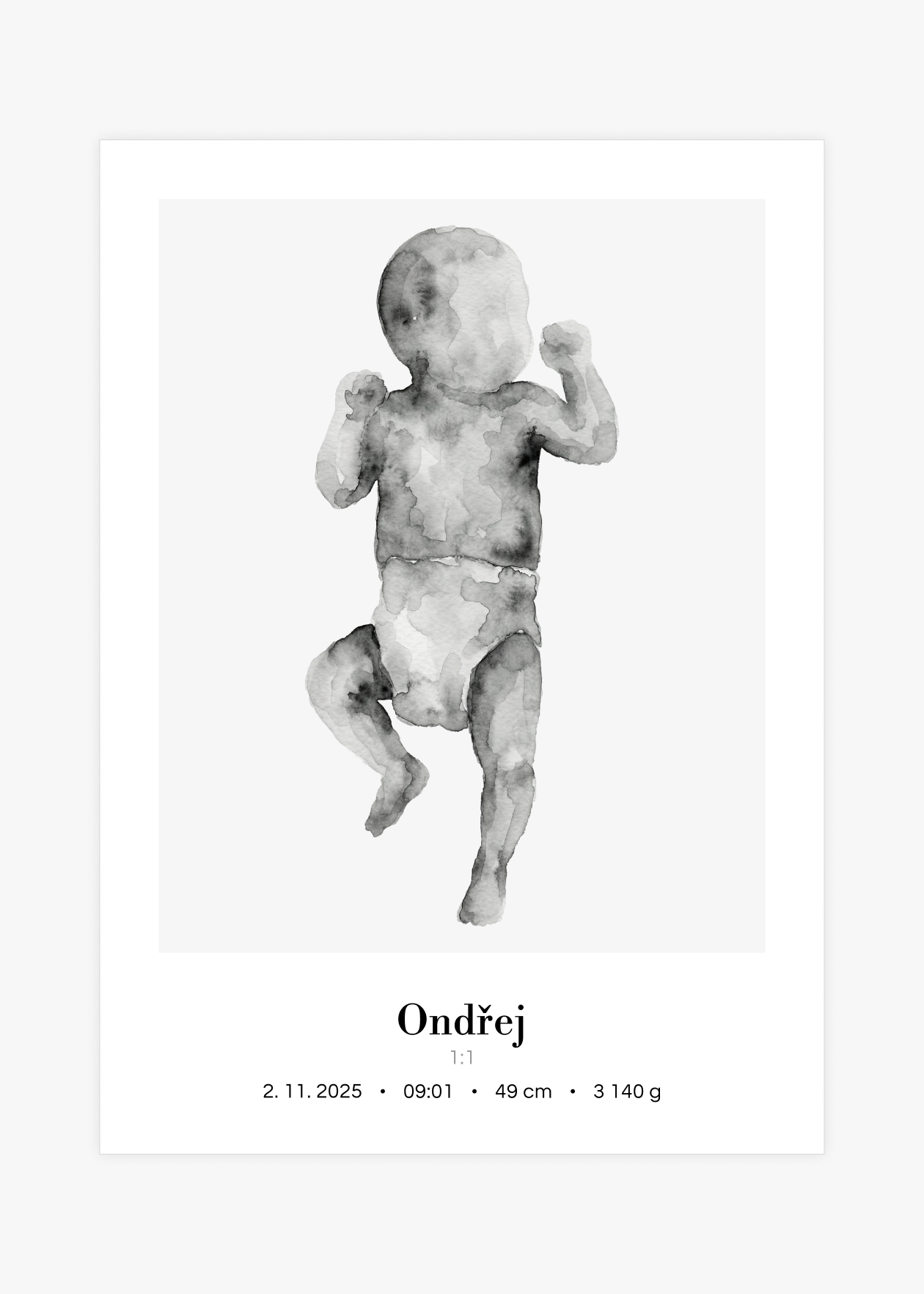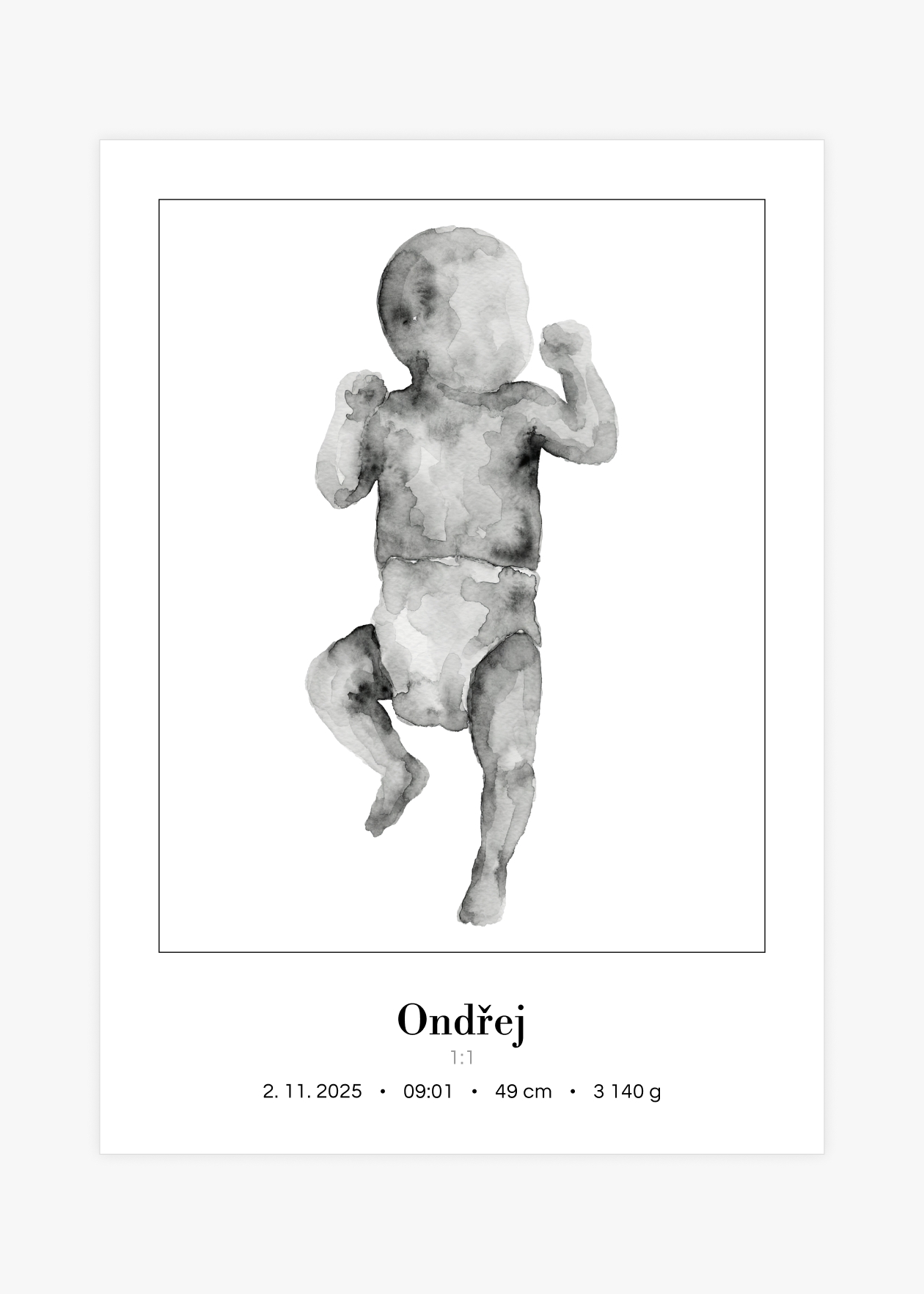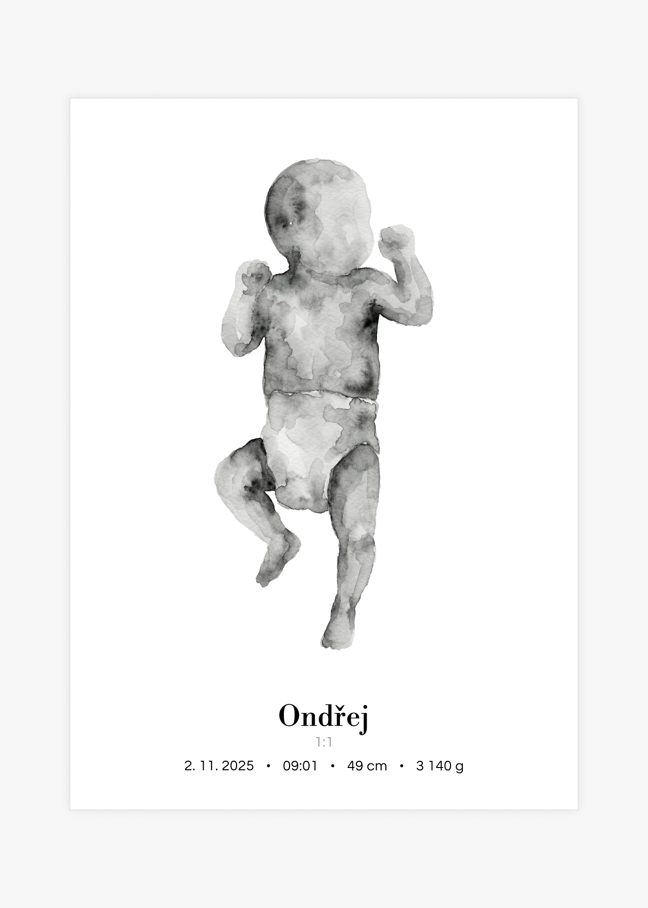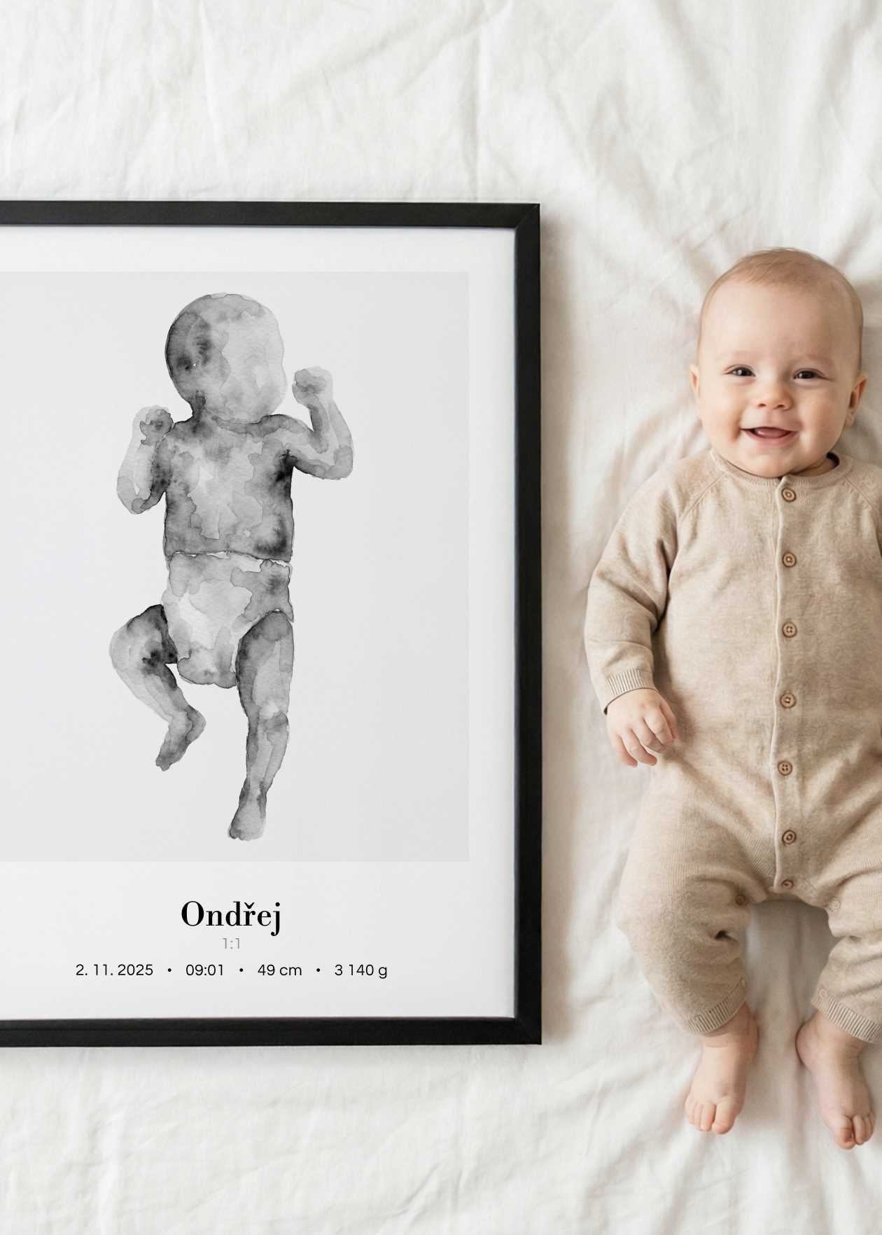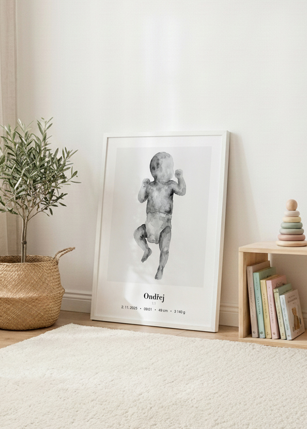 Plakát s ilustrací miminka v životní velikosti a personalizovaným textem ve spodní části. Originální způsob, jak si uchovat vzpomínku na jeden z nejdůležitějších okamžiků v životě – narození miminka. Tento plakát zachycuje vaše děťátko v přesné délce, jakou mělo při narození. Ilustrace je doplněna o personalizovaný text se jménem, datem, časem narození, délkou a váhou. Plakát je k dispozici ve velikosti 50 × 70 cm a je vytvořen ve skutečném měřítku 1:1 – postavička miminka tedy odpovídá přesně délce, kterou nám zadáte. Navíc si můžete vybrat ze 3 variant pozadí: bílé, šedé nebo s tenkým rámečkem. Krásná dekorace do dětského pokoje i jedinečný dárek pro novopečené rodiče.