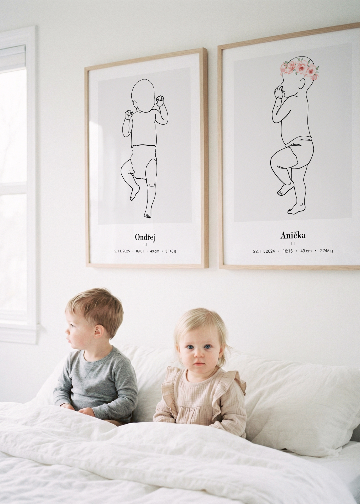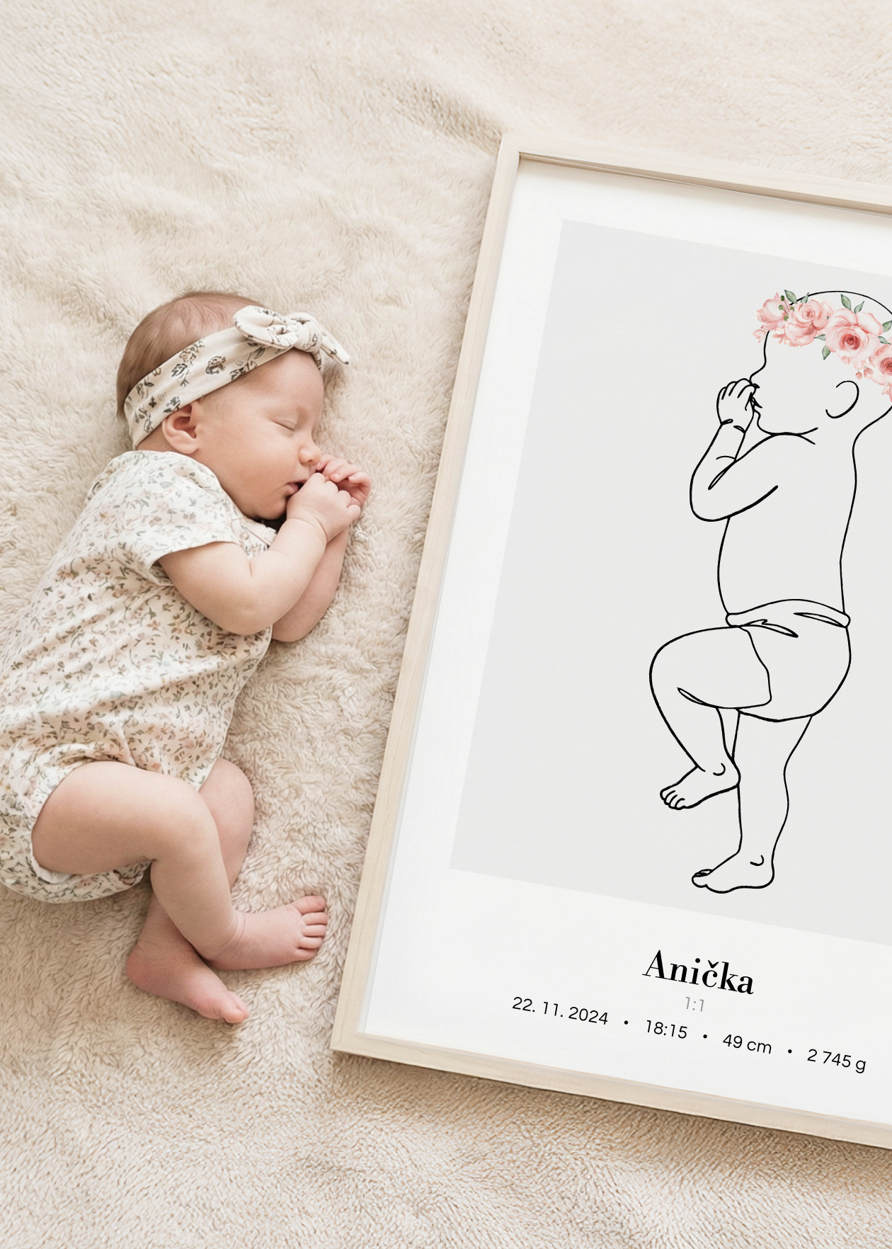 Plakát s ilustrací miminka v životní velikosti a personalizovaným textem ve spodní části. Originální způsob, jak si uchovat vzpomínku na jeden z nejdůležitějších okamžiků v životě – narození miminka. Tento plakát zachycuje vaše děťátko v přesné délce, jakou mělo při narození. Ilustrace je doplněna o personalizovaný text se jménem, datem, časem narození, délkou a váhou. Plakát je k dispozici ve velikosti 50 × 70 cm a je vytvořen ve skutečném měřítku 1:1 – postavička miminka tedy odpovídá přesně délce, kterou nám zadáte. Navíc si můžete vybrat ze 3 variant pozadí: bílé, šedé nebo s tenkým rámečkem. Krásná dekorace do dětského pokoje i jedinečný dárek pro novopečené rodiče.