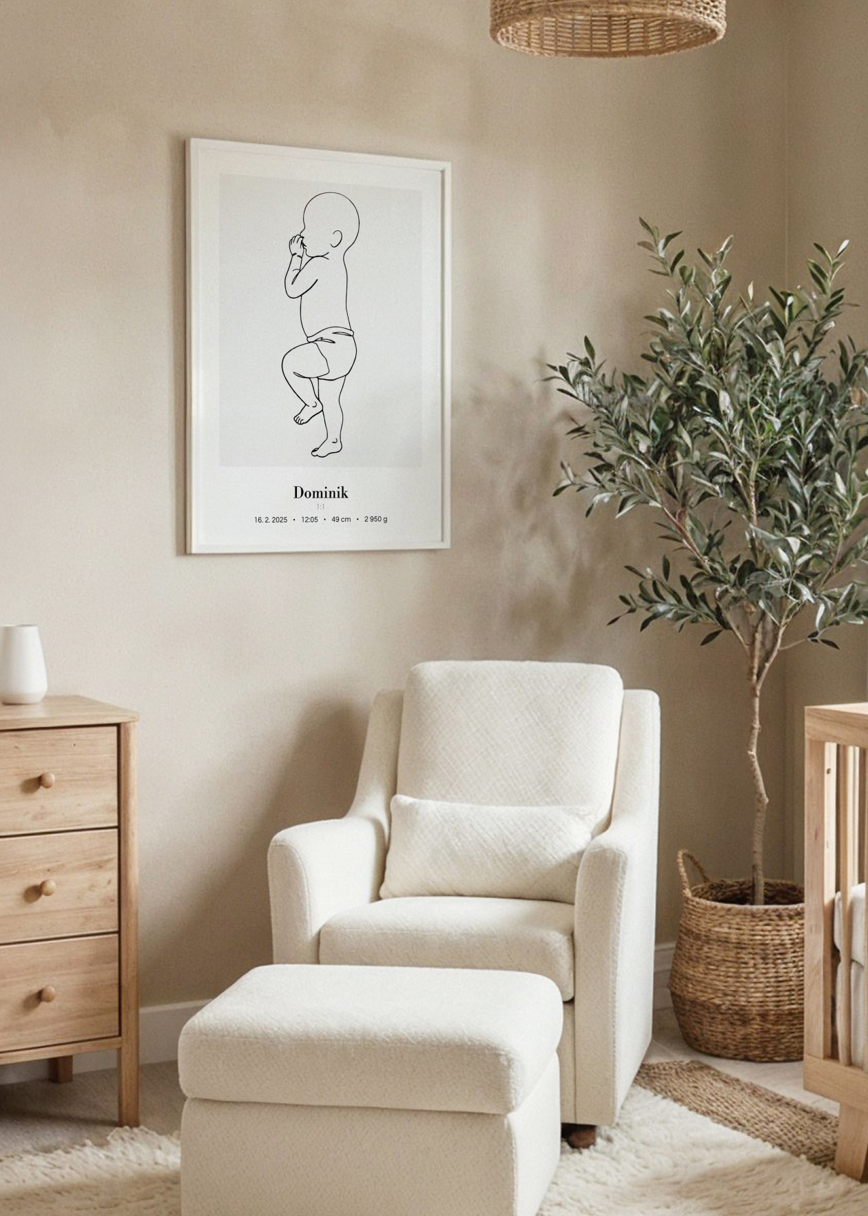 Plakát s ilustrací miminka v životní velikosti a personalizovaným textem ve spodní části. Originální způsob, jak si uchovat vzpomínku na jeden z nejdůležitějších okamžiků v životě – narození miminka. Tento plakát zachycuje vaše děťátko v přesné délce, jakou mělo při narození. Ilustrace je doplněna o personalizovaný text se jménem, datem, časem narození, délkou a váhou. Plakát je k dispozici ve velikosti 50 × 70 cm a je vytvořen ve skutečném měřítku 1:1 – postavička miminka tedy odpovídá přesně délce, kterou nám zadáte. Navíc si můžete vybrat ze 3 variant pozadí: bílé, šedé nebo s tenkým rámečkem. Krásná dekorace do dětského pokoje i jedinečný dárek pro novopečené rodiče.