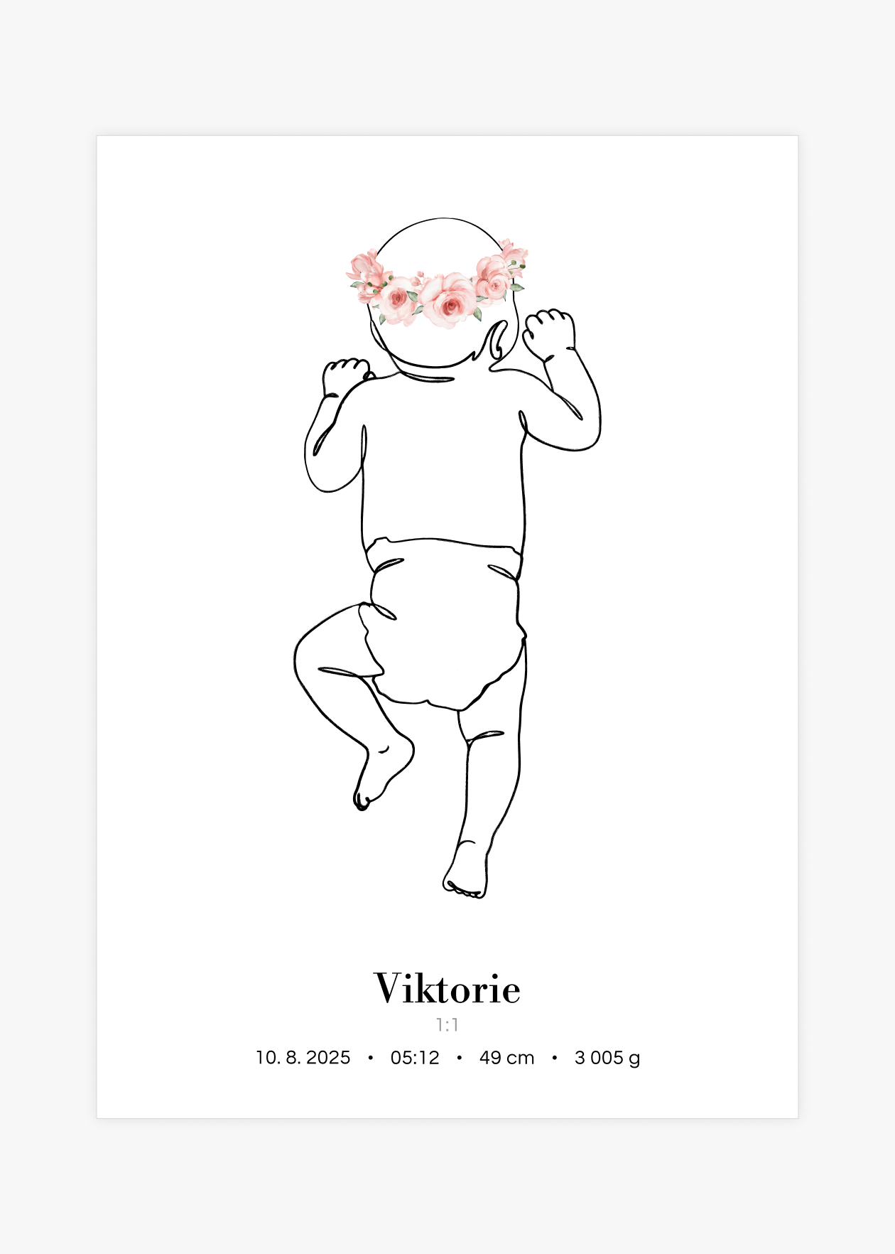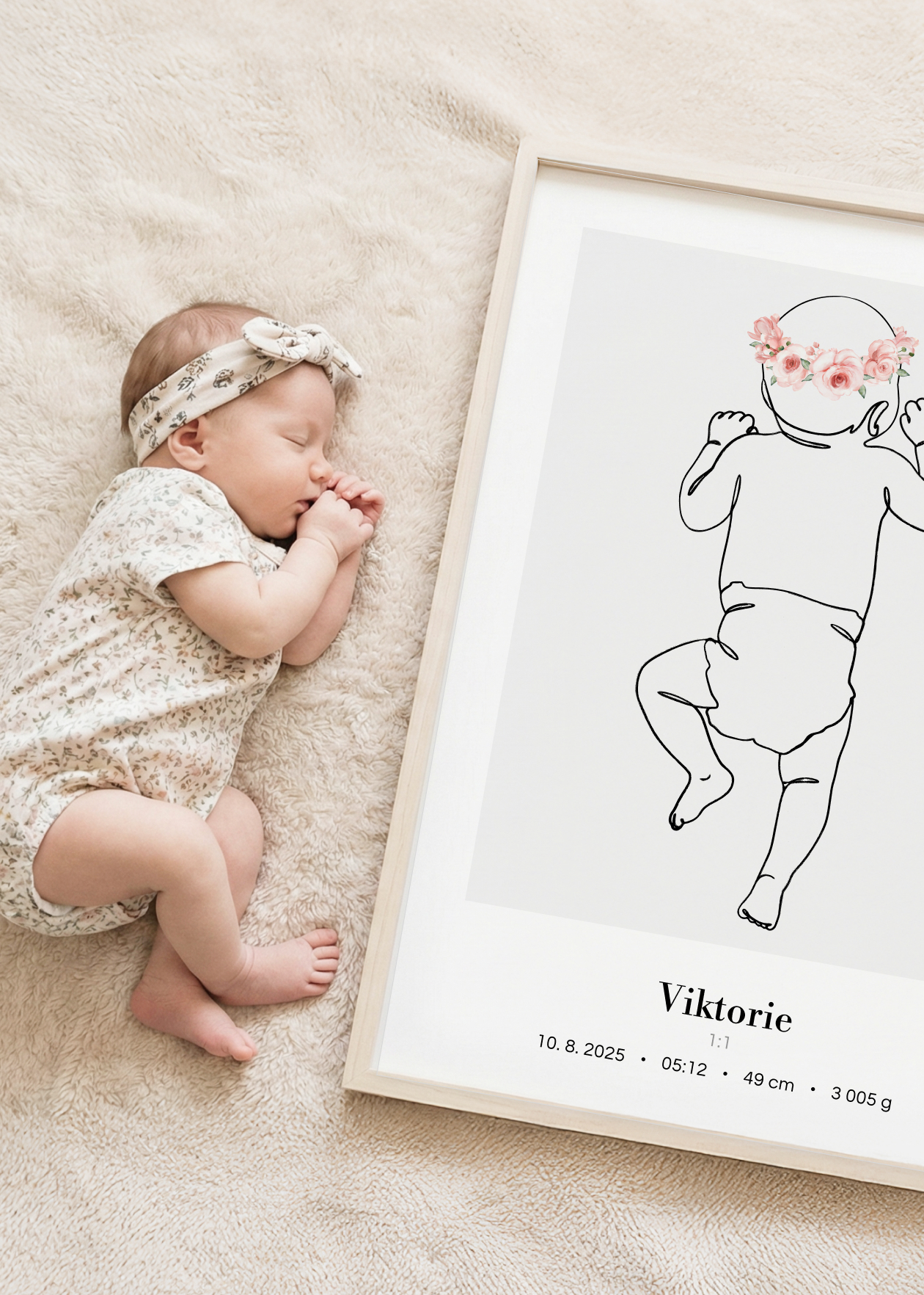 Plakát s ilustrací miminka v životní velikosti a personalizovaným textem ve spodní části. Originální způsob, jak si uchovat vzpomínku na jeden z nejdůležitějších okamžiků v životě – narození miminka. Tento plakát zachycuje vaše děťátko v přesné délce, jakou mělo při narození. Ilustrace je doplněna o personalizovaný text se jménem, datem, časem narození, délkou a váhou. Plakát je k dispozici ve velikosti 50 × 70 cm a je vytvořen ve skutečném měřítku 1:1 – postavička miminka tedy odpovídá přesně délce, kterou nám zadáte. Navíc si můžete vybrat ze 3 variant pozadí: bílé, šedé nebo s tenkým rámečkem. Krásná dekorace do dětského pokoje i jedinečný dárek pro novopečené rodiče.