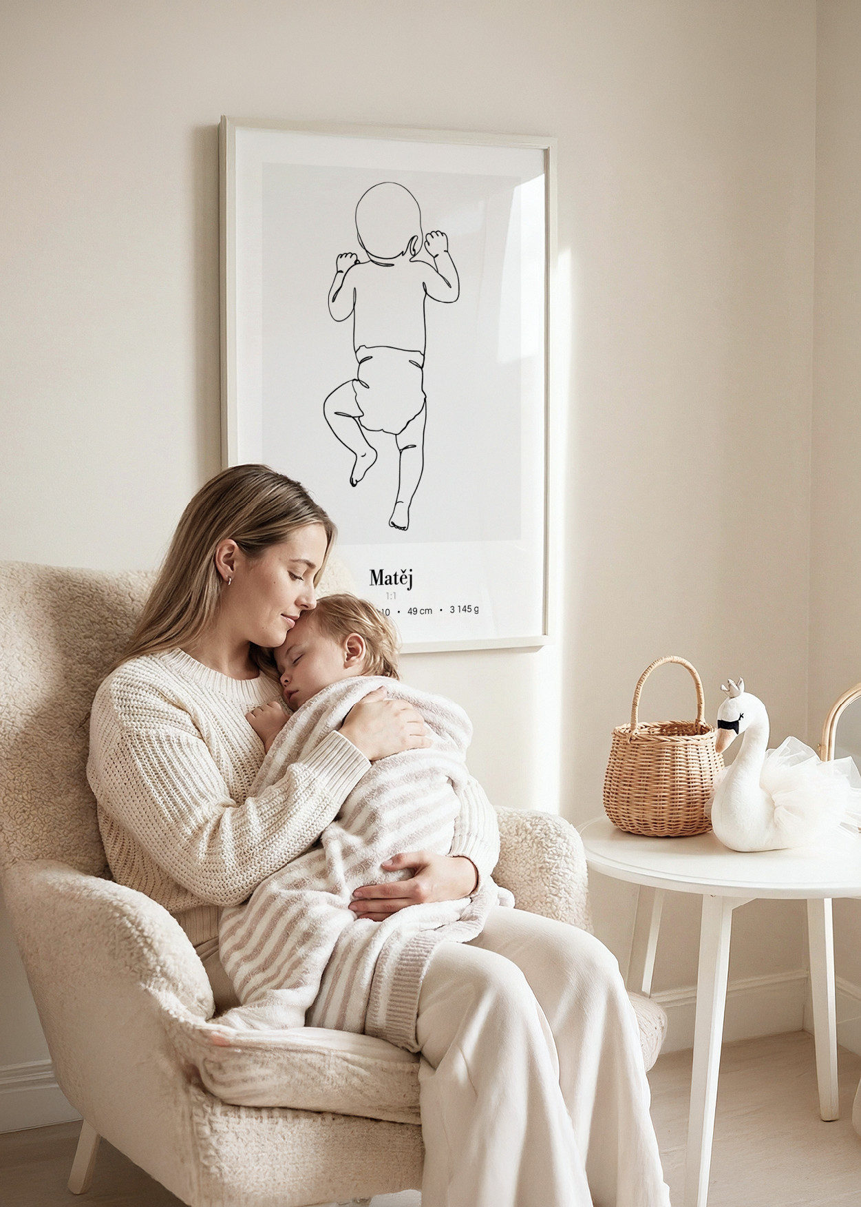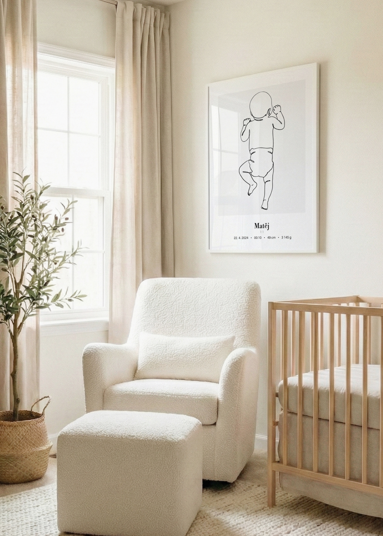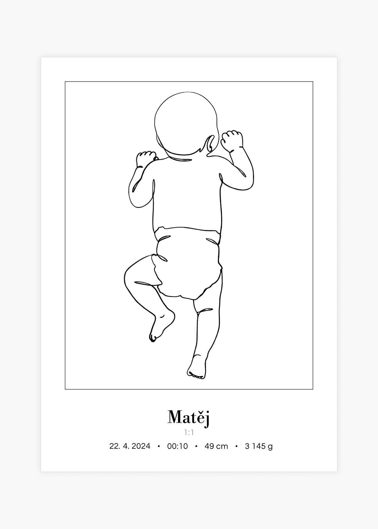 Plakát s ilustrací miminka v životní velikosti a personalizovaným textem ve spodní části. Originální způsob, jak si uchovat vzpomínku na jeden z nejdůležitějších okamžiků v životě – narození miminka. Tento plakát zachycuje vaše děťátko v přesné délce, jakou mělo při narození. Ilustrace je doplněna o personalizovaný text se jménem, datem, časem narození, délkou a váhou. Plakát je k dispozici ve velikosti 50 × 70 cm a je vytvořen ve skutečném měřítku 1:1 – postavička miminka tedy odpovídá přesně délce, kterou nám zadáte. Navíc si můžete vybrat ze 3 variant pozadí: bílé, šedé nebo s tenkým rámečkem. Krásná dekorace do dětského pokoje i jedinečný dárek pro novopečené rodiče.