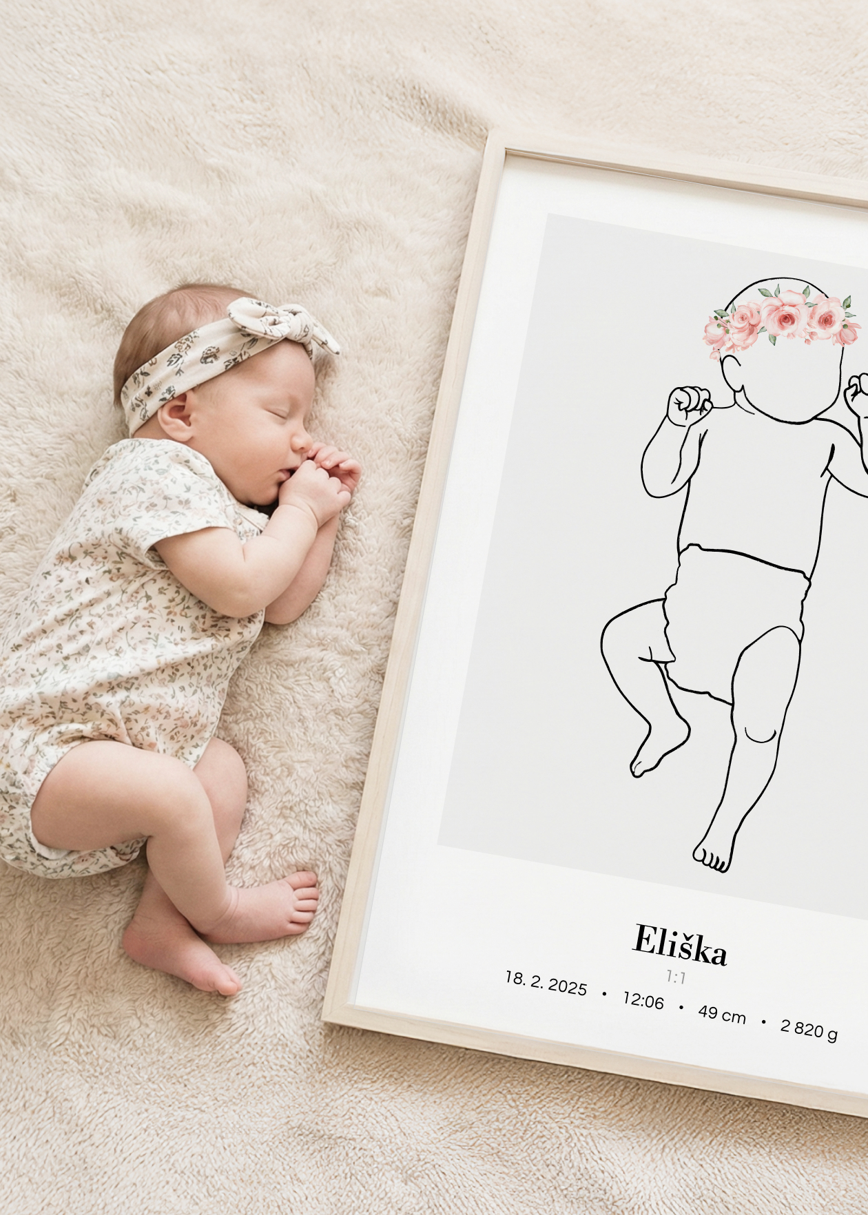 Plakát s ilustrací miminka v životní velikosti a personalizovaným textem ve spodní části. Originální způsob, jak si uchovat vzpomínku na jeden z nejdůležitějších okamžiků v životě – narození miminka. Tento plakát zachycuje vaše děťátko v přesné délce, jakou mělo při narození. Ilustrace je doplněna o personalizovaný text se jménem, datem, časem narození, délkou a váhou. Plakát je k dispozici ve velikosti 50 × 70 cm a je vytvořen ve skutečném měřítku 1:1 – postavička miminka tedy odpovídá přesně délce, kterou nám zadáte. Navíc si můžete vybrat ze 3 variant pozadí: bílé, šedé nebo s tenkým rámečkem. Krásná dekorace do dětského pokoje i jedinečný dárek pro novopečené rodiče.
