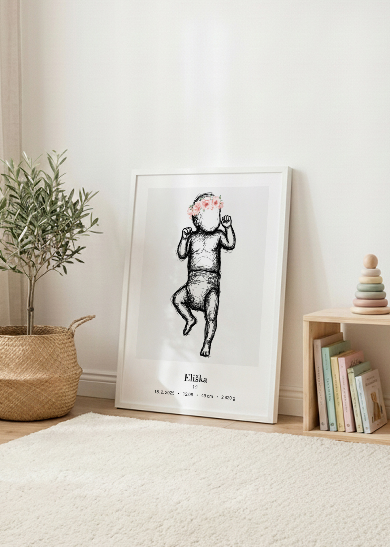Plakát s ilustrací miminka v životní velikosti a personalizovaným textem ve spodní části. Originální způsob, jak si uchovat vzpomínku na jeden z nejdůležitějších okamžiků v životě – narození miminka. Tento plakát zachycuje vaše děťátko v přesné délce, jakou mělo při narození. Ilustrace je doplněna o personalizovaný text se jménem, datem, časem narození, délkou a váhou. Plakát je k dispozici ve velikosti 50 × 70 cm a je vytvořen ve skutečném měřítku 1:1 – postavička miminka tedy odpovídá přesně délce, kterou nám zadáte. Navíc si můžete vybrat ze 3 variant pozadí: bílé, šedé nebo s tenkým rámečkem. Krásná dekorace do dětského pokoje i jedinečný dárek pro novopečené rodiče.