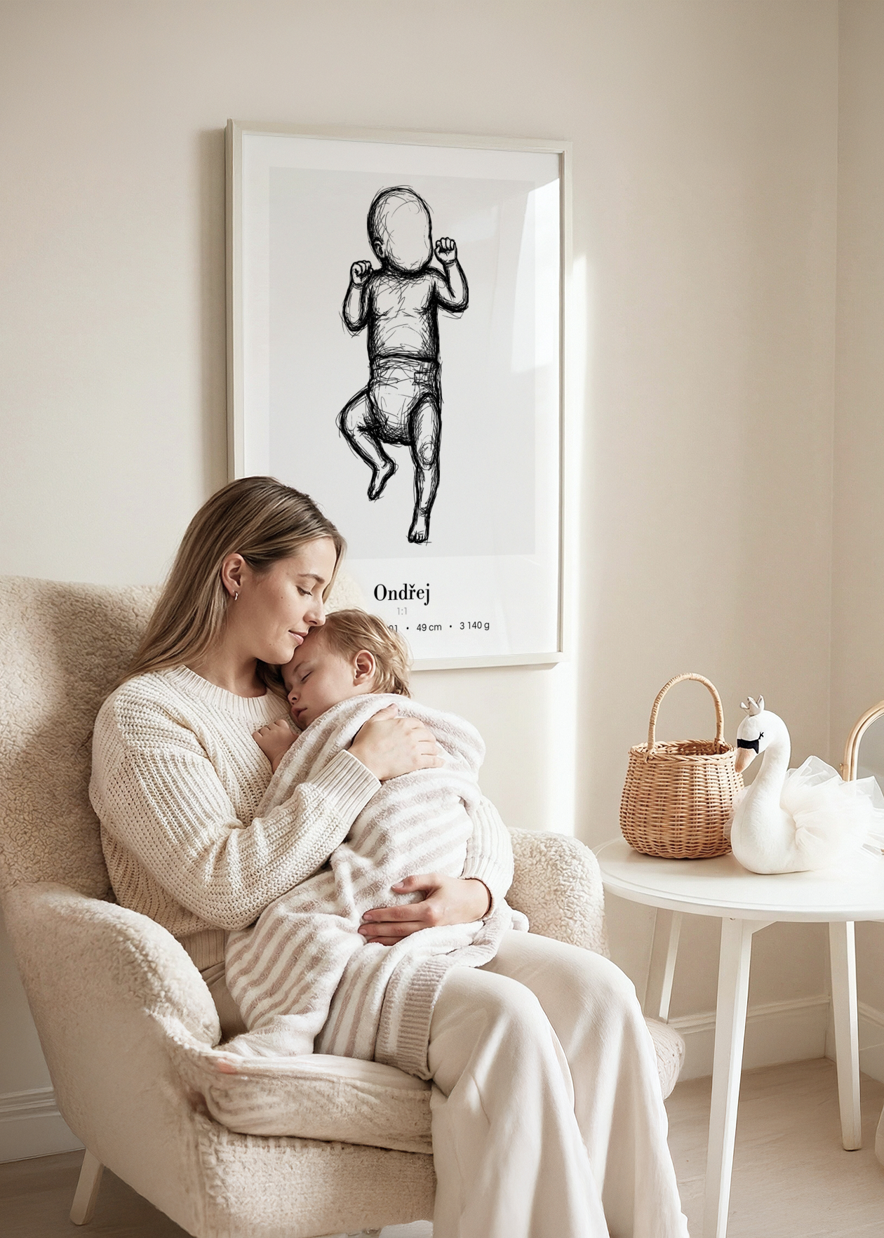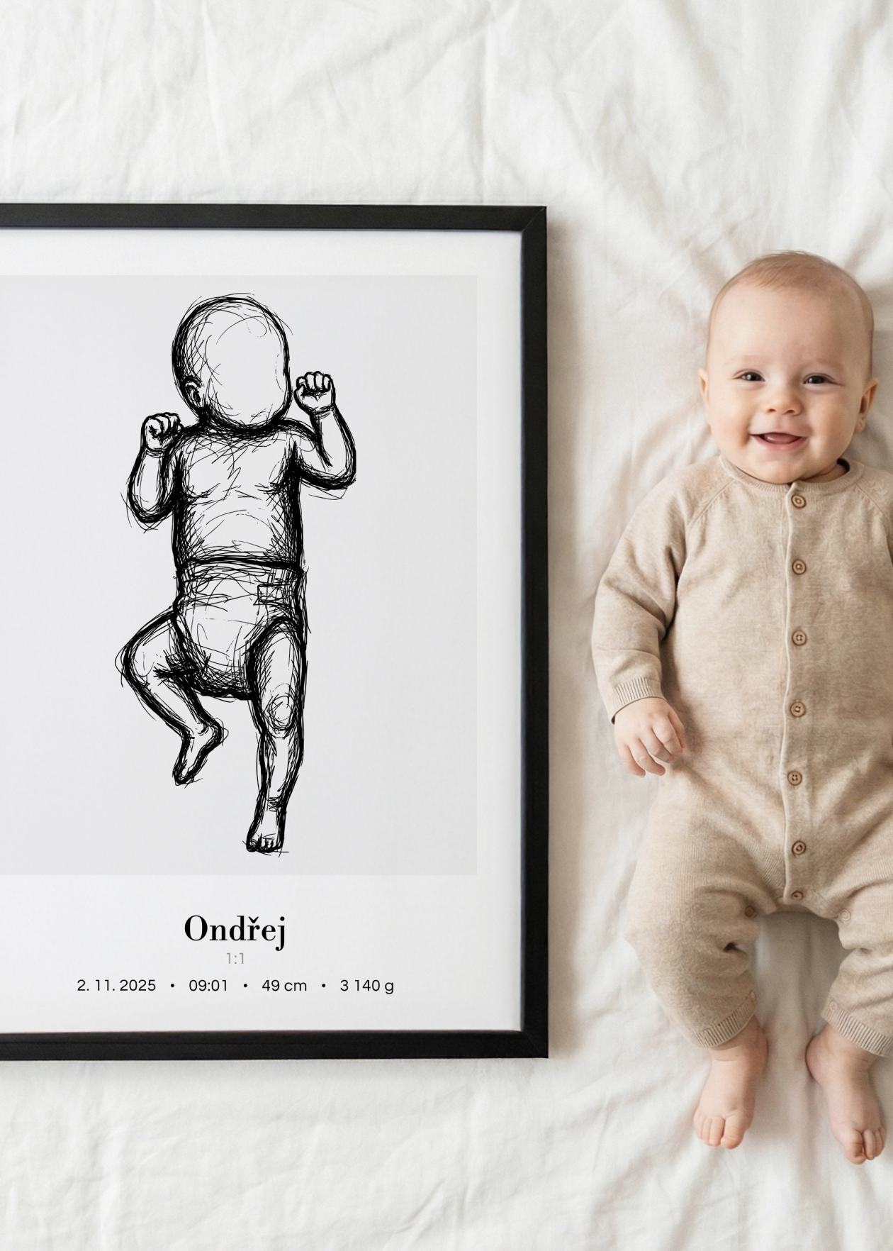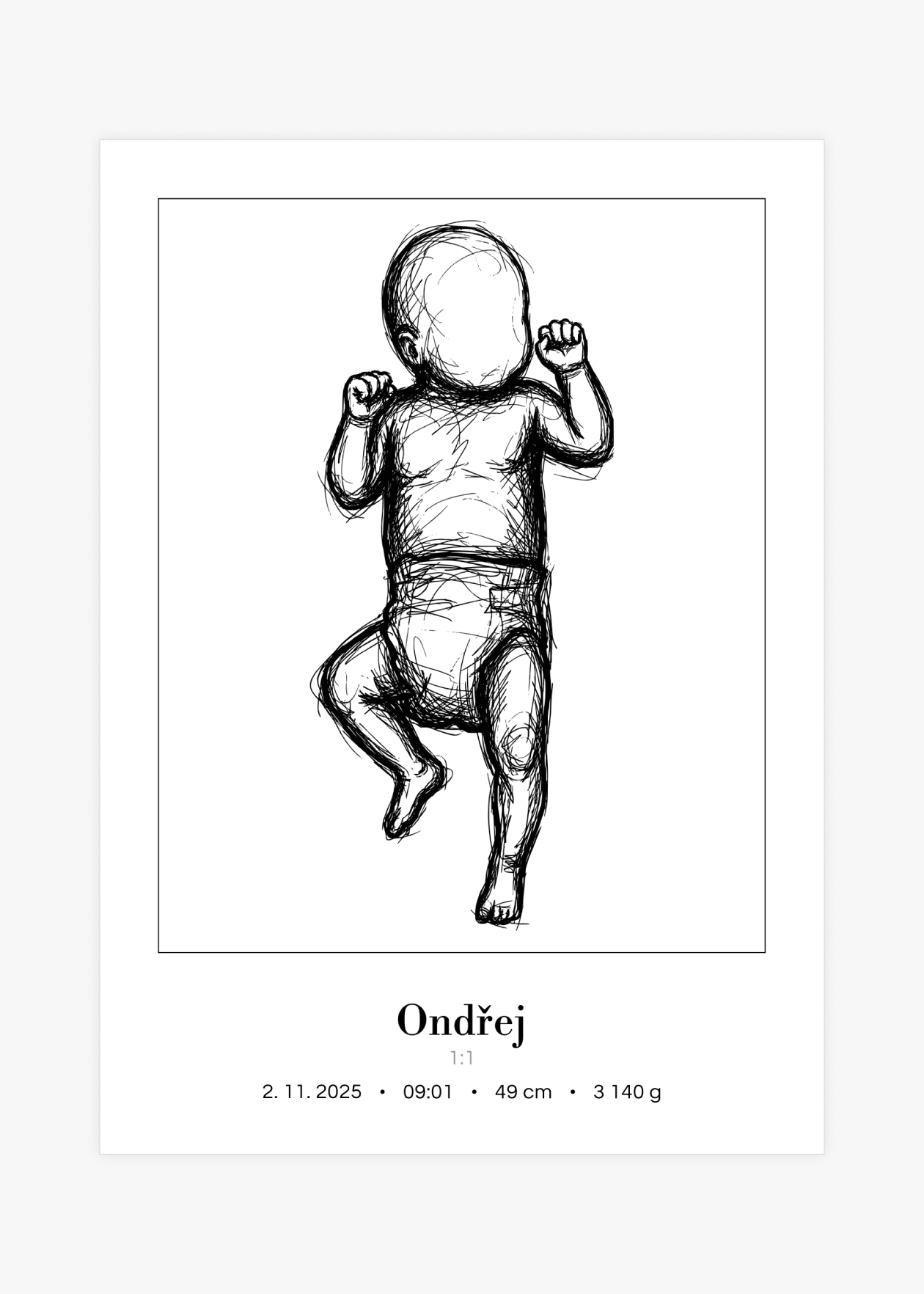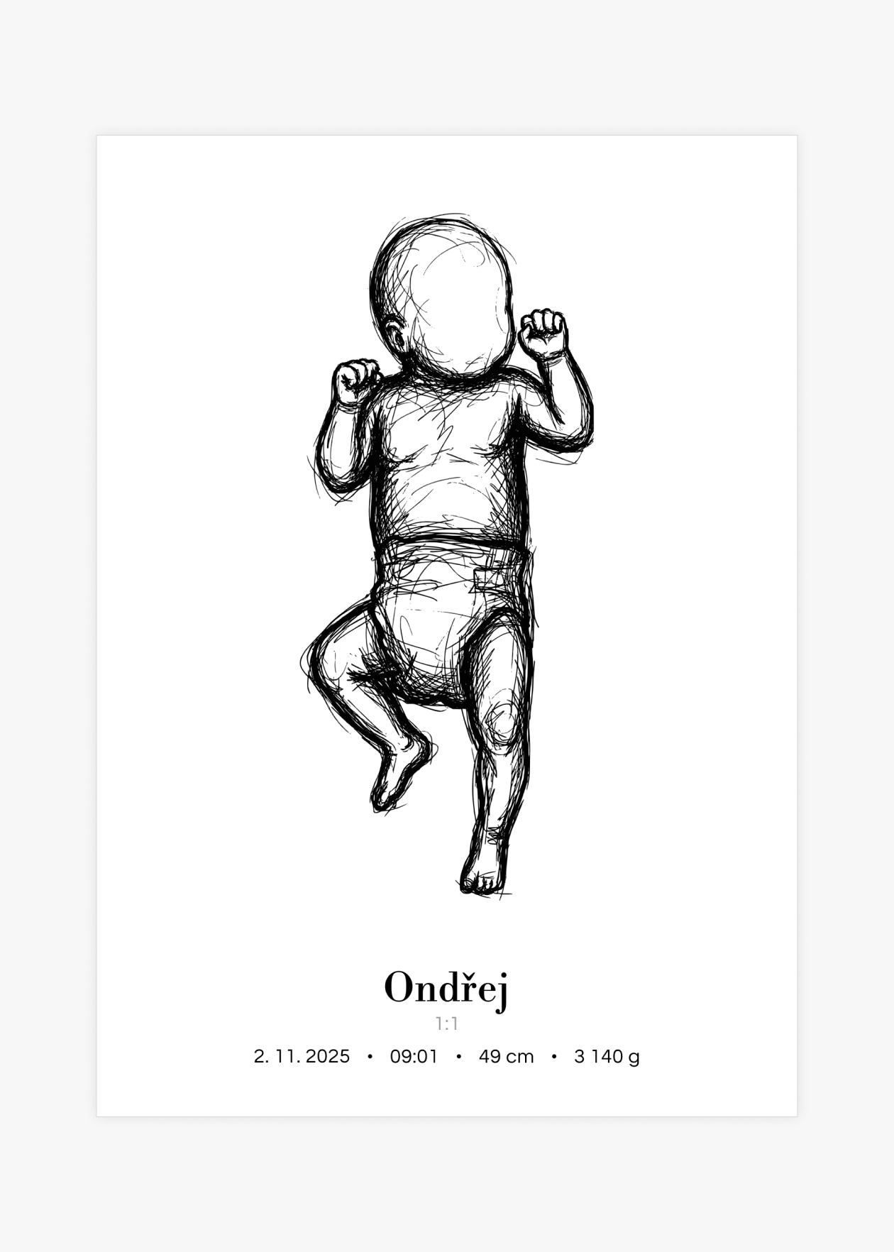 Plakát s ilustrací miminka v životní velikosti a personalizovaným textem ve spodní části. Originální způsob, jak si uchovat vzpomínku na jeden z nejdůležitějších okamžiků v životě – narození miminka. Tento plakát zachycuje vaše děťátko v přesné délce, jakou mělo při narození. Ilustrace je doplněna o personalizovaný text se jménem, datem, časem narození, délkou a váhou. Plakát je k dispozici ve velikosti 50 × 70 cm a je vytvořen ve skutečném měřítku 1:1 – postavička miminka tedy odpovídá přesně délce, kterou nám zadáte. Navíc si můžete vybrat ze 3 variant pozadí: bílé, šedé nebo s tenkým rámečkem. Krásná dekorace do dětského pokoje i jedinečný dárek pro novopečené rodiče.