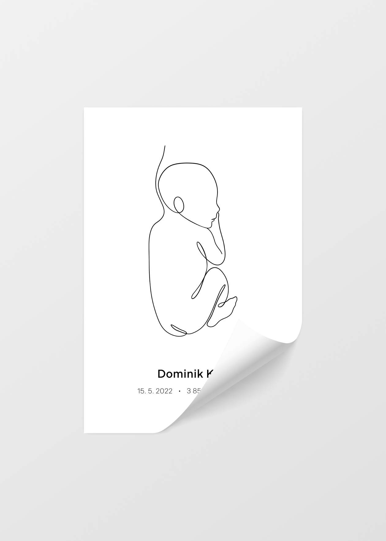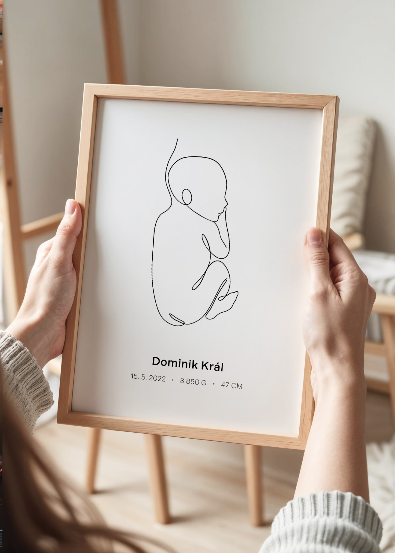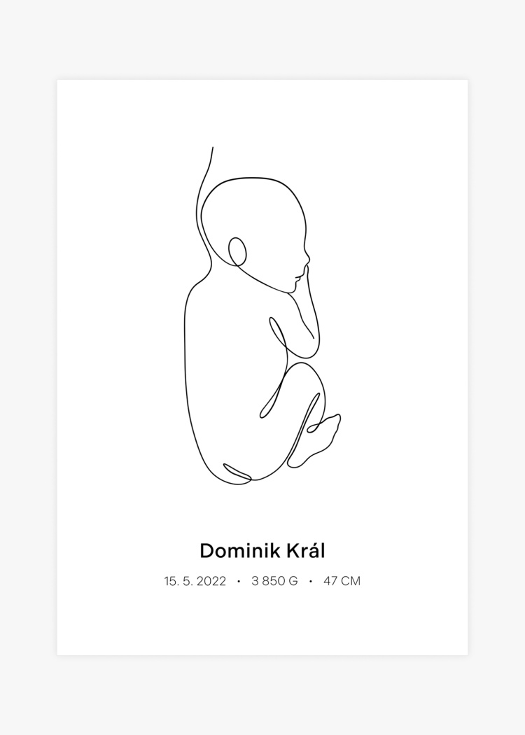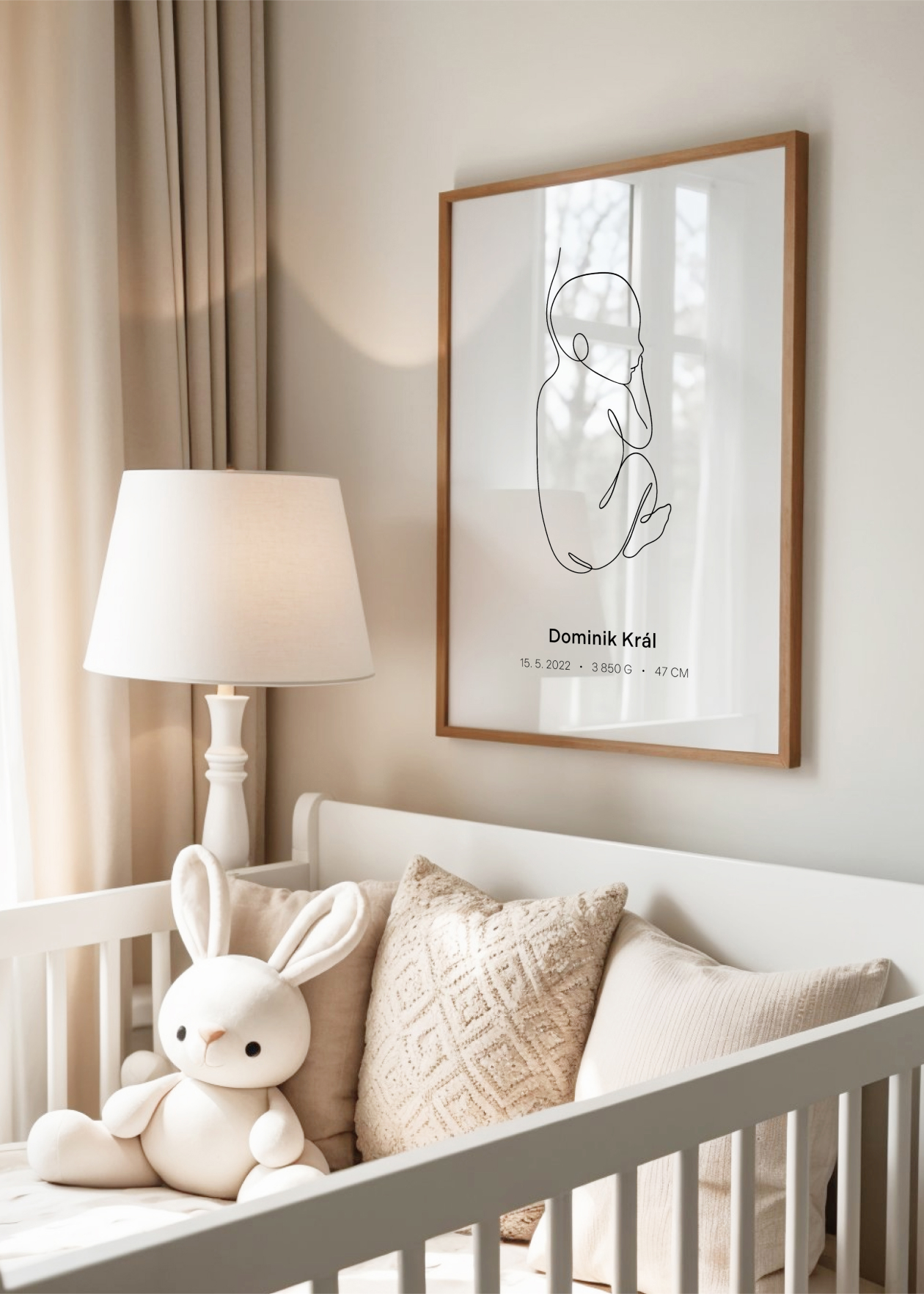 Plakát s jemnou ilustrací miminka na bílém pozadí, doplněný o personalizovaný text – jméno, datum narození, váhu a délku. Uchovejte si vzpomínku na den, kdy se narodil váš malý zázrak. Zvýrazněte důležité údaje a vytvořte tak originální plakát připomínající tento výjimečný den. Skvělý tip na originální dárek pro novopečené rodiče. Elegantní, nadčasový kousek do dětského pokojíčku i jako dekorace domova.