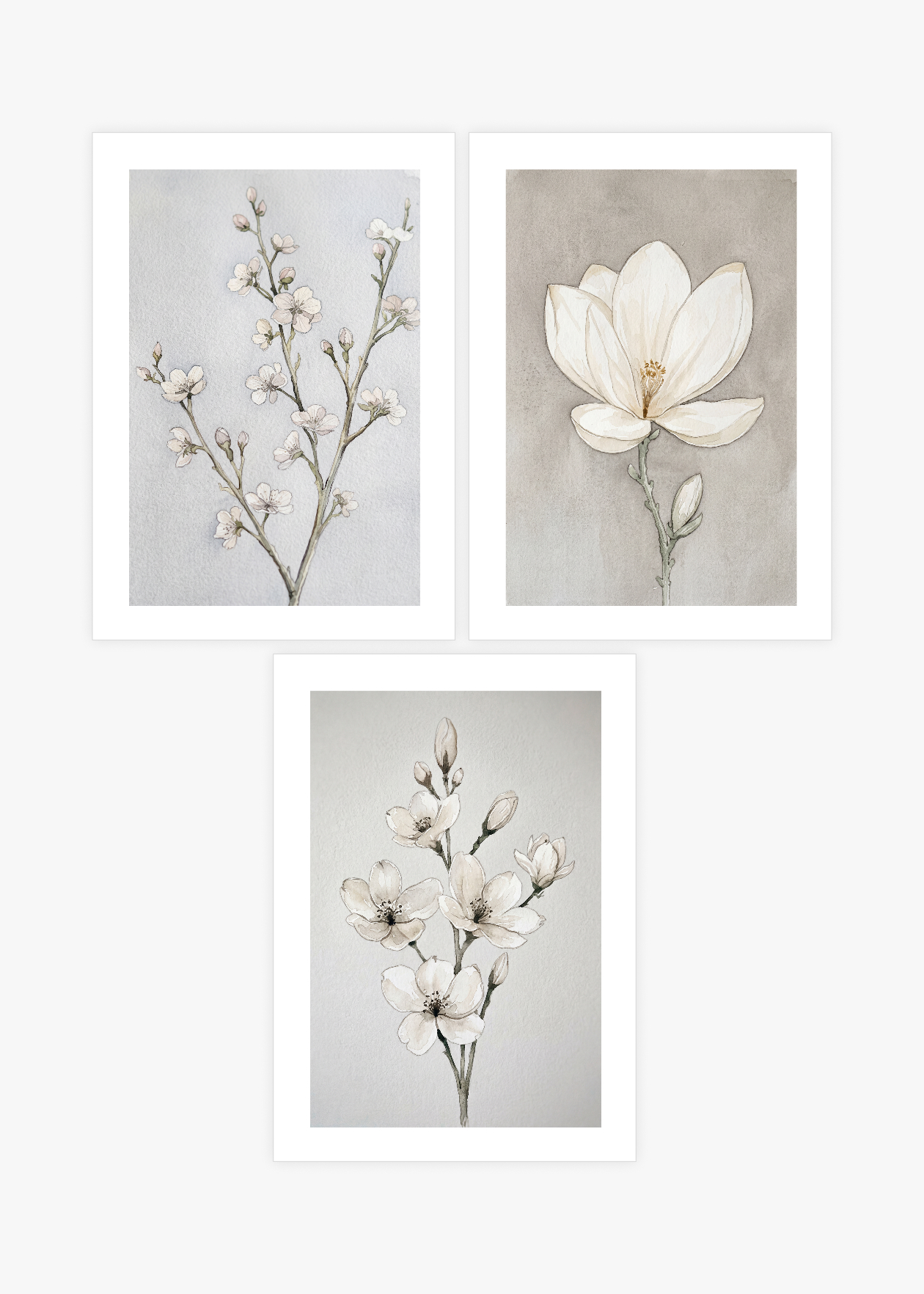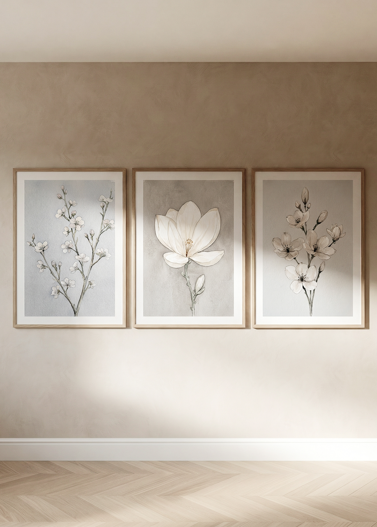 Vytvořte si doma dokonalou oázu klidu s touto sladěnou sadou tří plakátů z kolekce Esence květu. Nádherné akvarelové ilustrace křehkých jarních květů v jemných zemitých a neutrálních tónech vnesou do vašeho interiéru pocit naprosté harmonie a lehkosti. Tento pečlivě sestavený minimalistický triptych působí nesmírně uklidňujícím dojmem a je ideální volbou pro zútulnění ložnice, světlého obývacího pokoje nebo relaxačního koutku. Ušetřete čas s výběrem a proměňte své zdi v nadčasovou květinovou galerii.