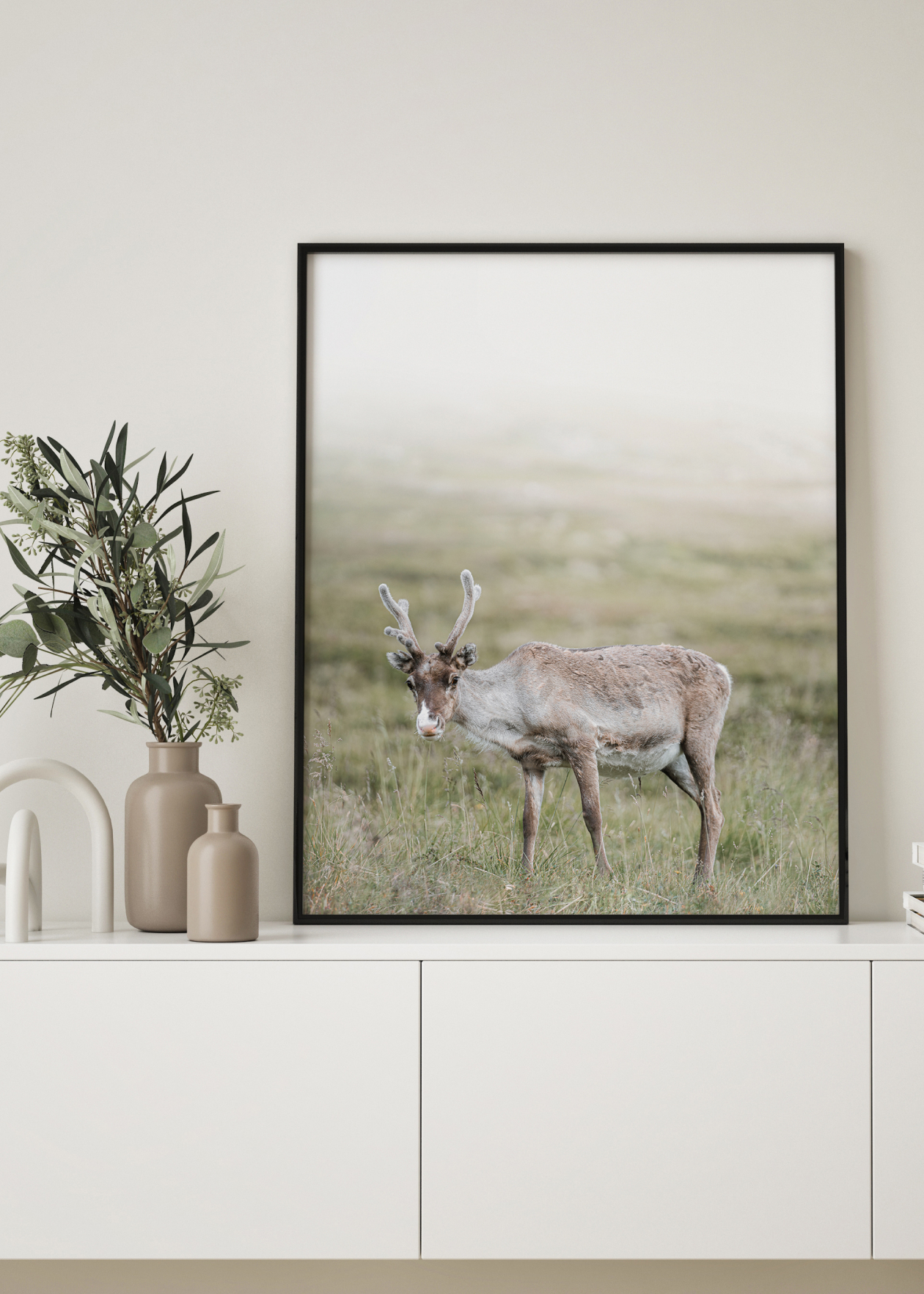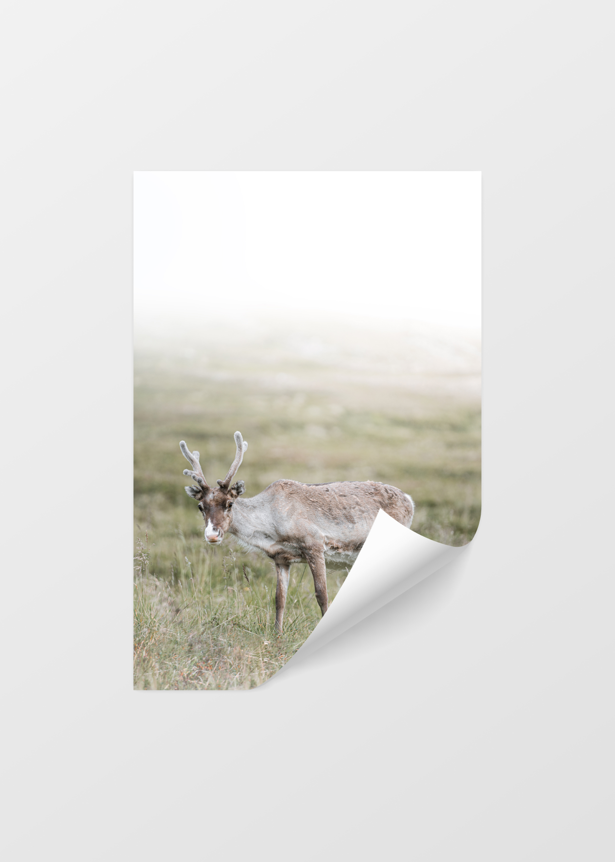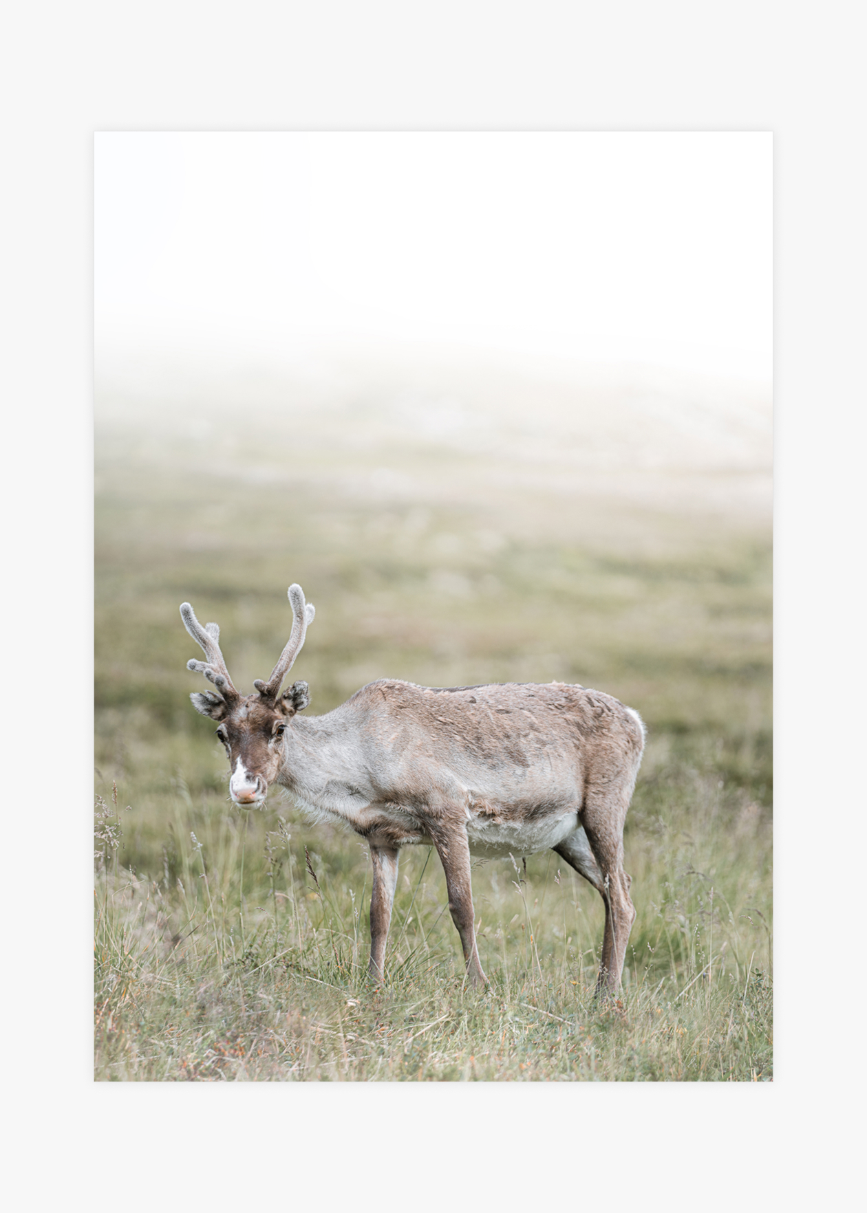 Fotografický plakát se sobem pasoucího se na louce. Tento plakát byl vyfotografován na úplném severu Norska, kde se sobi běžně vyskytují. Skvěle se hodí do stylové domácnosti.